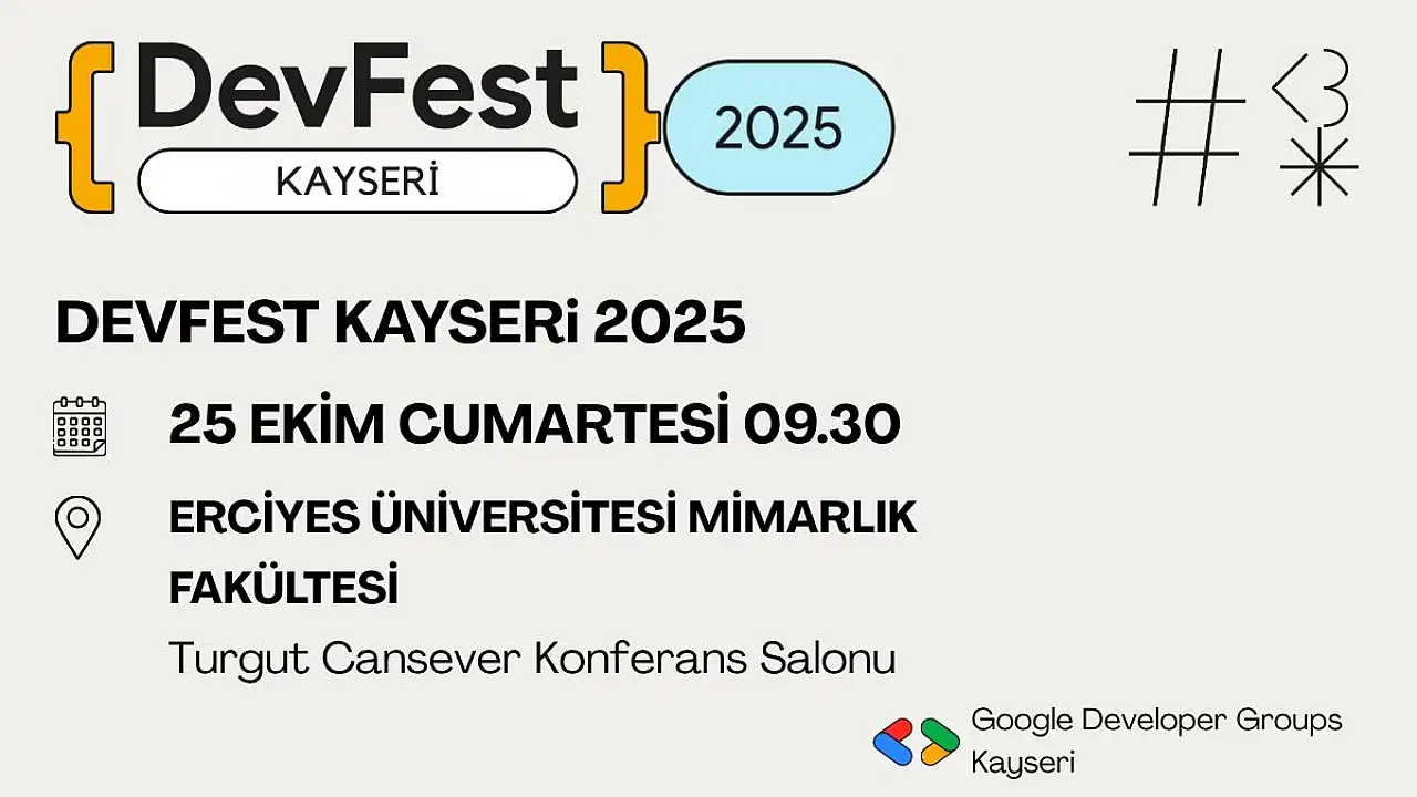 GDG Kayseri tarafından yapılan paylaşımda, ‘’DevFest Kayseri 2025 için geri sayım başladı!’’ ifadeleriyle etkinlik duyuruldu. Buna göre, Erciyes Üniversitesi Mimarlık Fakültesi Turgut Cansever Konferans Salonu’nda düzenlenecek etkinlik, 25 Ekim Cumartesi 09.30’da gerçekleşecek. Etkinliğe katılım ücretsiz ancak bilet almak zorunlu kılındı.
