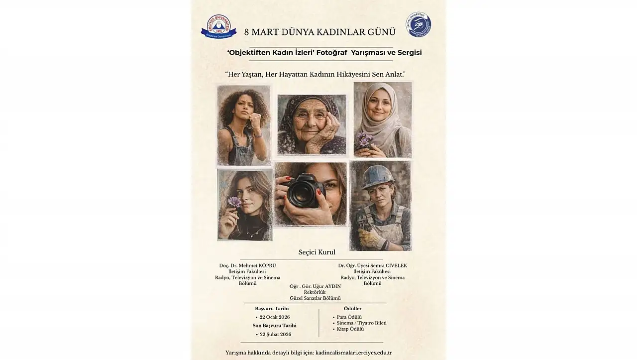 rciyes Üniversitesi’nde hazırlanan “Objektiften Kadın İzleri” temalı fotoğraf yarışmasına başvurular başladı. 8 Mart Dünya Kadınlar Günü kapsamında düzenlenen fotoğraf yarışmasının detayları belli oldu.