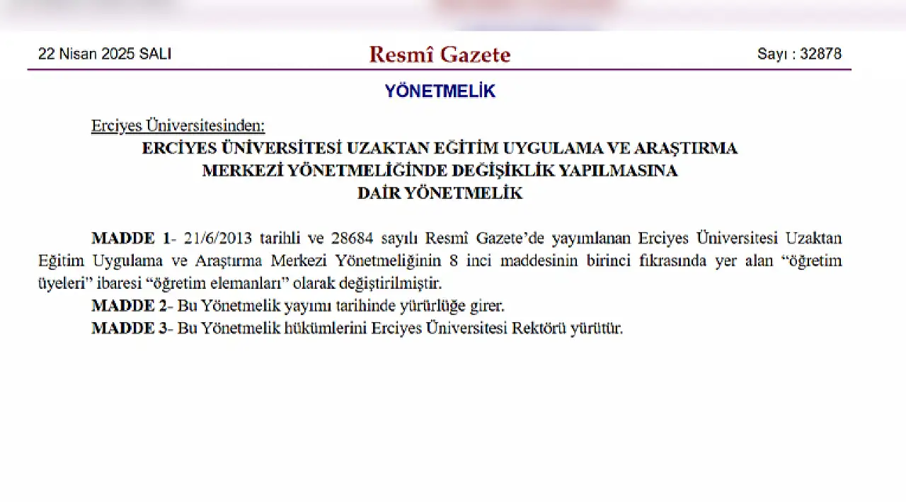 Erciyes Üniversitesi Uzaktan Eğitim Uygulama ve Araştırma Merkezi Yönetmeliğinde Değişiklik Yapılmasına Dair Yönetmelik Resmi Gazete'de yayımlandı. Artık sadece profesör, doçent ve doktor öğretim üyeleri değil, aynı zamanda öğretim görevlileri ve araştırma görevlileri de uzaktan eğitimde görev alabilecek.