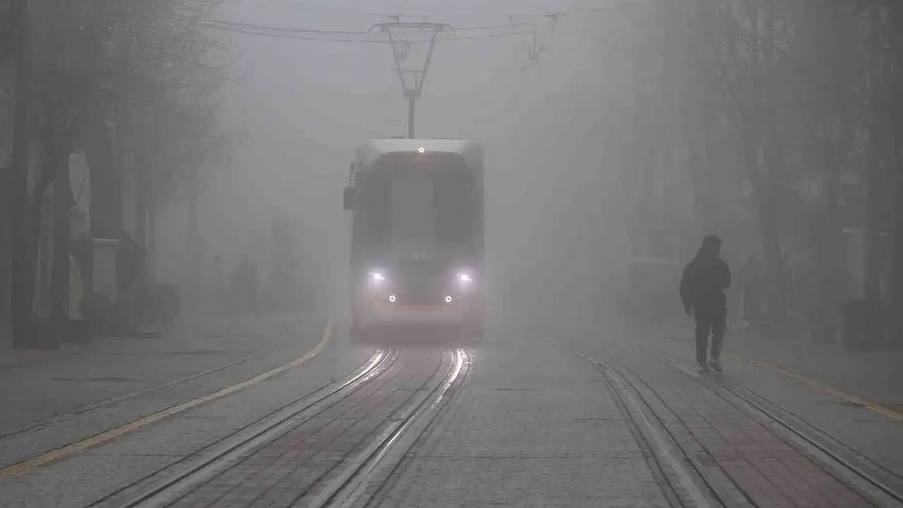 Eskişehir'de pazar sabahı etkili olan yoğun sis, kent merkezinde görüş mesafesini düşürdü. Sis içindeki tramvaylar ve sokaklar fotoğraflık görüntüler oluşturdu.