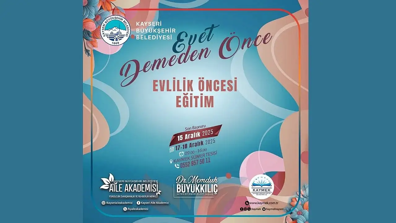 Büyükşehir Belediyesi Aile Akademisi tarafından düzenlenecek 'Evet Demeden Önce Evlilik Öncesi Eğitim' programı için son kayıt tarihi 15 Aralık olarak belirlendi. Detaylar Kayseri Anadolu Haber'de...