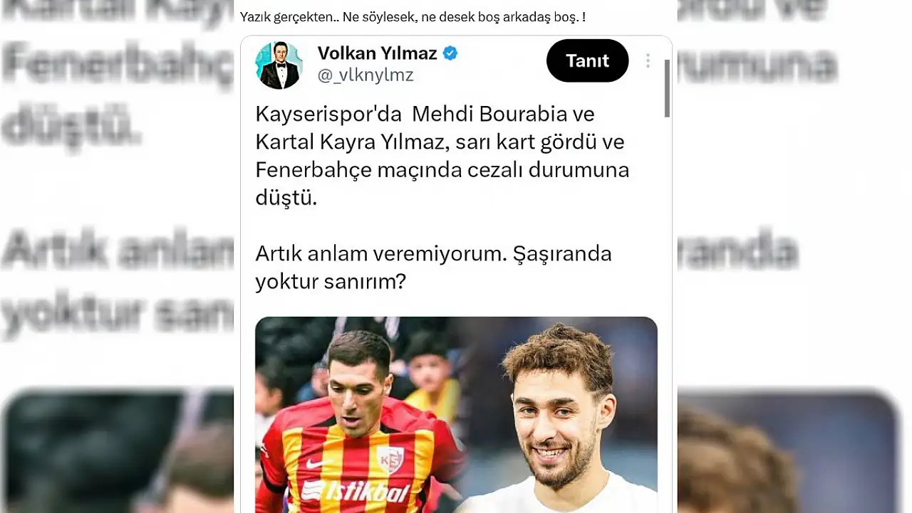 Yılmaz, hafta içinde, “Kayserispor’da Mehdi Bourabia ve Kartal Kayra Yılmaz sarı kart gördü ve Fenerbahçe maçında cezalı duruma düştü. Artık anlam veremiyorum. Şaşıran da yoktur sanırım” diye paylaşım yapmıştı.