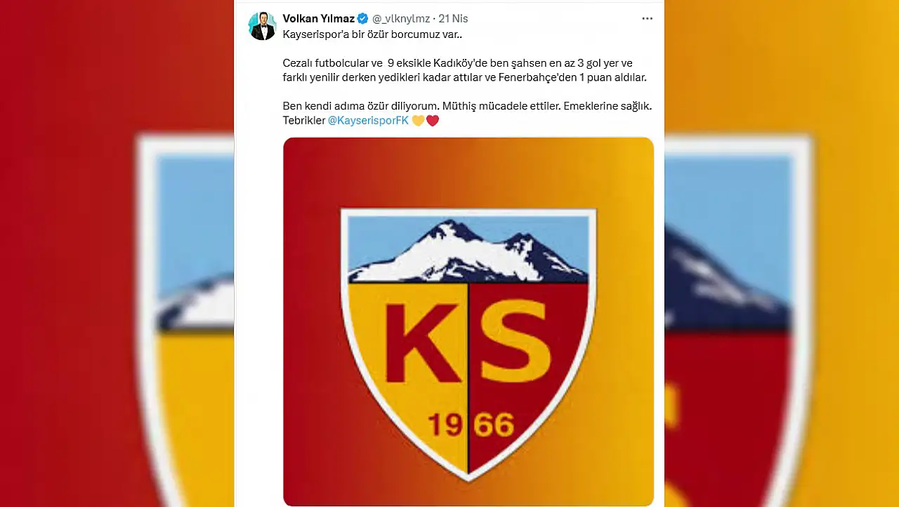 Galatasaray'a yakınlığı ile bilinen gazeteci Volkan Yılmaz, Kayserispor'un Fenerbahçe maçındaki mücadelesi sonrası özür diledi. Taraftarlar, diğer yorumculardan da aynı adımı bekliyor. Ayrıntılar Kayseri Anadolu Haber'de...
