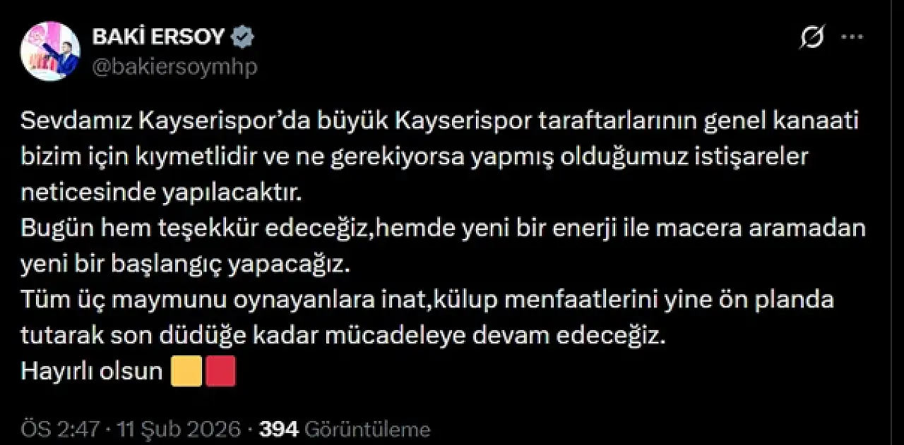 Baki Ersoy yaptığı paylaşımda şu ifadeleri kullandı; "Sevdamız Kayserispor’da büyük Kayserispor taraftarlarının genel kanaati bizim için kıymetlidir ve ne gerekiyorsa yapmış olduğumuz istişareler neticesinde yapılacaktır.