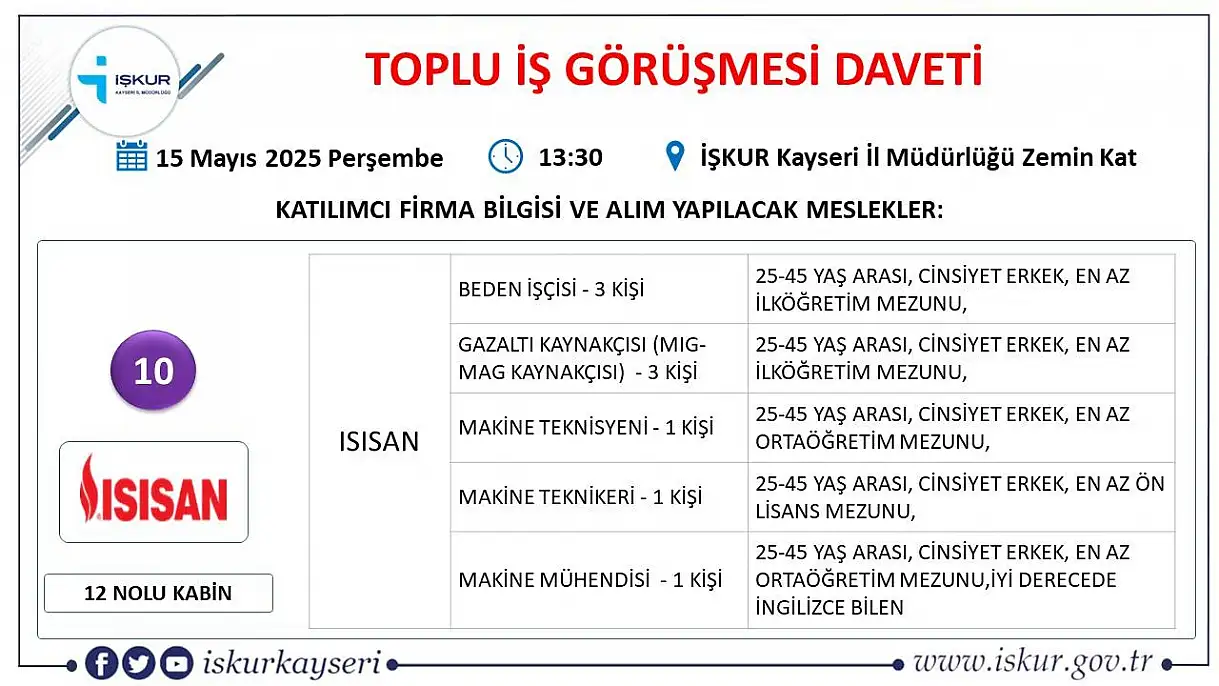 İŞKUR Kayseri İl Müdürlüğü binasında düzenlenecek olan toplu iş görüşmesine 18 firma bizzat katılım gösterecek. İş arayan vatandaşlar firmaların kurdukları masaları gezerek doğrudan görüşme ve iş başvurusunda bulunma fırsatı elde edecek. Bu ay toplu iş görüşmeleri 15 Mayıs Perşembe günü saat 13:30'da başlayacak. Çok sayıda farklı meslek grubundan 350 kişi için müracaatlar kabul edilecek.