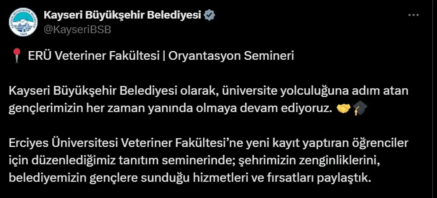 Kayseri Büyükşehir Belediyesi, üniversiteye yeni kayıt yaptıran öğrencilere yönelik tanıtım semineri düzenleyerek gençleri bilgilendirdi. Belediye, sosyal medya hesabından yaptığı açıklamada, üniversite yolculuğuna adım atan gençlerin her zaman yanında olmaya devam edeceklerini vurguladı. Erciyes Üniversitesi Veteriner Fakültesi’nde gerçekleştirilen seminerde, öğrenciler şehrin kültürel ve sosyal olanakları hakkında bilgilendirildi. Belediye yetkilileri, Kayseri’de gençlere sunulan hizmetler ve fırsatlar hakkında detaylı bilgiler aktardı.
