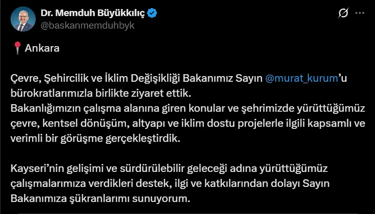 Kayseri Büyükşehir Belediye Başkanı Memduh Büyükkılıç, Bakan Murat Kurum’u ziyaret ederek şehrin çevre, kentsel dönüşüm ve altyapı projelerini görüştü. Başkan Büyükkılıç, Bakan Kurum ile yaptığı görüşmede Kayseri’de yürütülen çevre, kentsel dönüşüm, altyapı ve iklim dostu projeler hakkında bilgi verdi. Desteklerinden dolayı bakanına teşekkür etti.