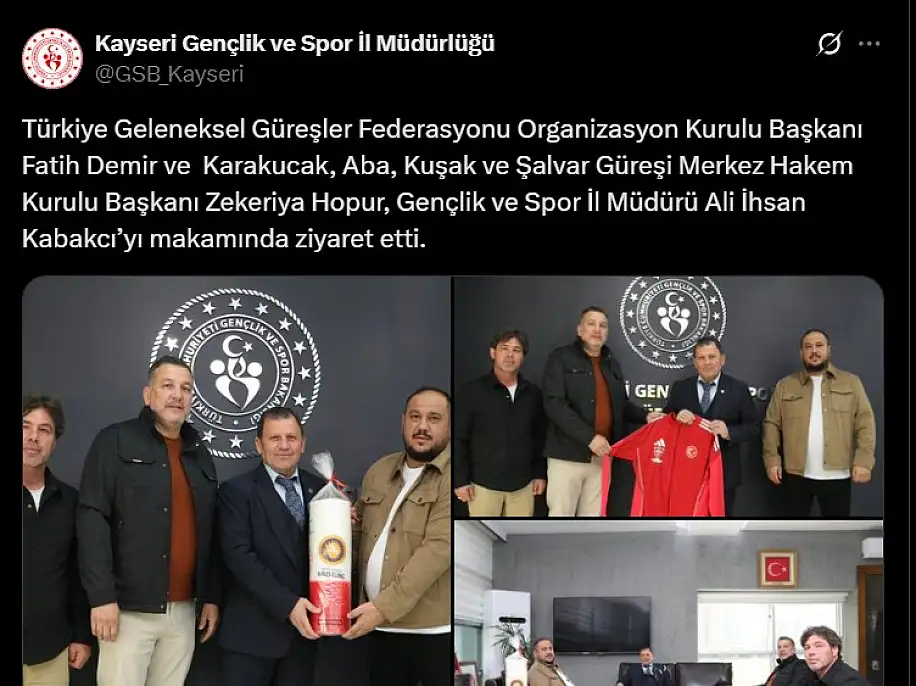 Türkiye Geleneksel Güreşler Federasyonu’ndan bir heyet, Kayseri Gençlik ve Spor İl Müdürü Ali İhsan Kabakcı’ya nezaket ziyaretinde bulundu. Organizasyon Kurulu Başkanı Fatih Demir ile Karakucak, Aba, Kuşak ve Şalvar Güreşi Merkez Hakem Kurulu Başkanı Zekeriya Hopur’un yer aldığı ziyaret sosyal medyada paylaşıldı.