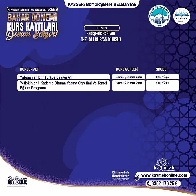 Kayseri’deki 6’ncı üniversite olarak faaliyet gösteren KAYMEK, yeni yılda da hizmetlerini hız kesmeden sürdürüyor. Bu çerçevede çocuklar ve gençler başta olmak üzere her yaş grubundan vatandaşa yönelik kaliteli ve zengin içeriklere sahip geniş yelpazedeki kurs çeşitliliği ile her yıl yüz binlerce insana dokunan KAYMEK’in 12 Ocak’ta başlattığı Sanat ve Mesleki Eğitim Bahar Dönemi kurs kayıtlarına müracaatları sürüyor. KAYMEK’in alanında uzman eğitmenleri tarafından tamamen ücretsiz olarak verilecek ve kontenjanları sınırları olan kurslar için kayıtlar www.kaymekonline.com internet adresi üzerinden gerçekleştirilebilecek. Kurslar hakkında detaylı bilgiye de bu internet adresi üzerinden ve 0 352 231 80 31 numaralı telefon üzerinden erişebilecek vatandaşlar, 1 Şubat 2026 tarihine kadar kayıt işlemlerini yapabilecek.