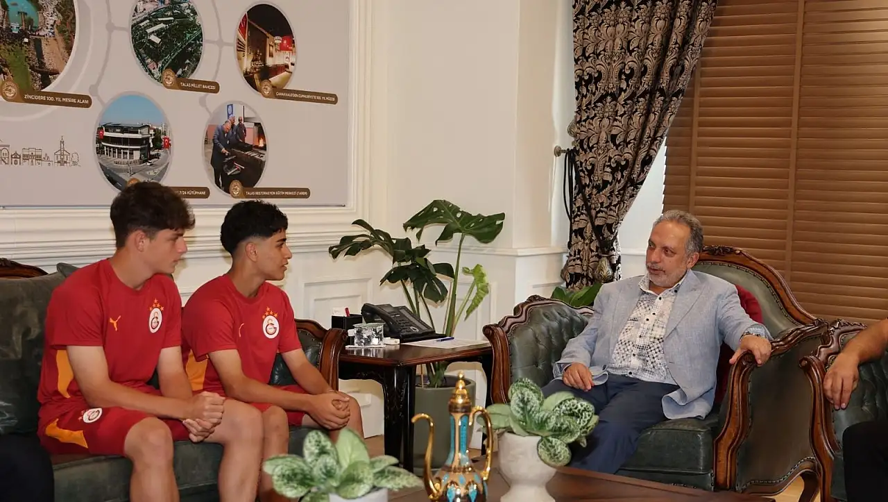 Talas Belediyespor altyapısından yetişerek Galatasaray'a transfer olan genç futbolcular Talas Belediye Başkanı ve Talas Belediyespor Onursal Başkanı Mustafa Yalçın'ı makamında ziyaret etti.
