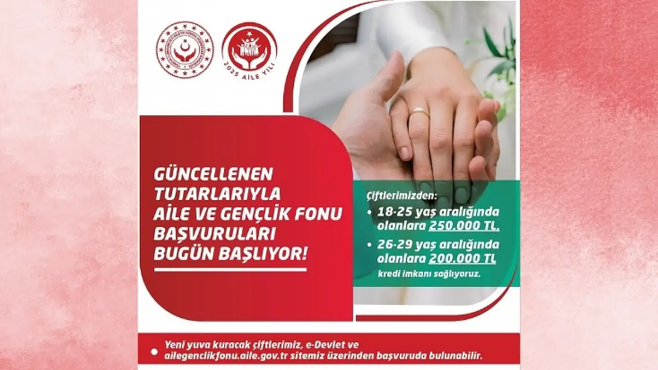 Aile ve Sosyal Hizmetler Bakanlığı tarafından genç çiftlere yönelik destek programı olan Aile ve Gençlik Fonu başvuruları bugün itibarıyla başladı. Detaylar Kayseri Anadolu Haber'de...