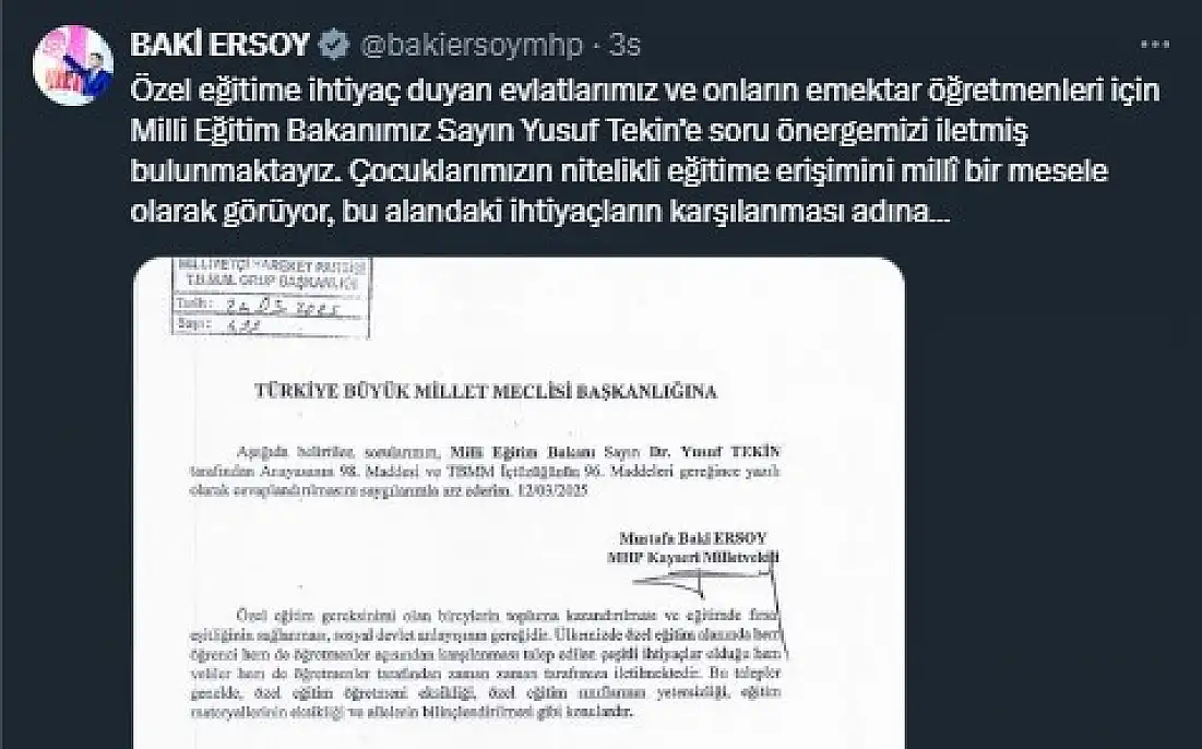 MHP Kayseri Milletvekili Baki Ersoy, özel eğitime ihtiyaç duyan çocuklar ve öğretmenleriyle ilgili Milli Eğitim Bakanı Yusuf Tekin’e soru önergesi iletti. Ersoy, ‘ Çocuklarımızın nitelikli eğitime erişimini millî bir mesele olarak görüyor, bu alandaki ihtiyaçların karşılanması adına gerekli adımların atılacağına inanıyoruz. Konunun takipçisi olacağız.’ ifadelerini kullandı.