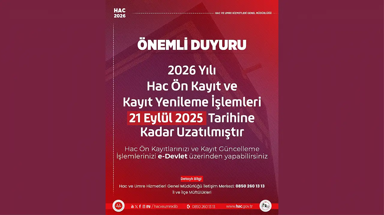 Diyanet İşleri Başkanı Prof. Dr. Ali Erbaş yaptığı açıklamada ‘’2026 Yılı Hac ön kayıt ve kayıt güncelleme işlemleri vatandaşlarımızdan gelen yoğun talep üzerine 21 Eylül 2025 tarihine kadar uzatıldı.’’ İfadelerini kullandı.