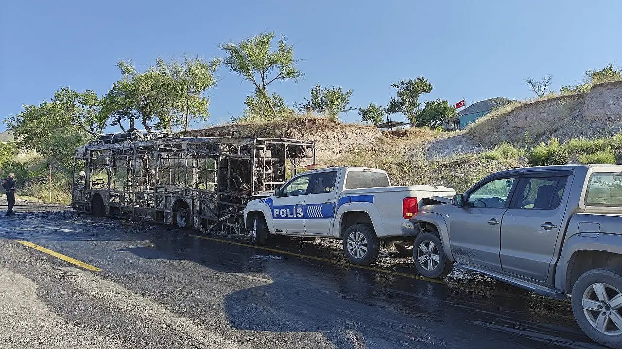 Kayseri’nin Hacılar ilçesinde yanan halk otobüsü küle dönerken, geriye doğru kaçarak arkasındaki 1 polis aracına ve 1 ticari araca da çarptı.
