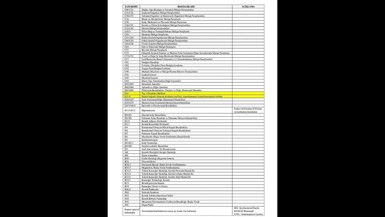 Listede, özellikle uzun süreli tedavi gerektiren ve günlük yaşamı doğrudan etkileyen hastalık grupları yer alıyor. Kanser türleri, Tip 1 diyabet, ciddi kalp ve damar hastalıkları, kronik böbrek ve karaciğer rahatsızlıkları ile KOAH ve ağır astım gibi solunum yolu hastalıkları dikkat çeken başlıklar arasında bulunuyor. Tablodaki tanılar, sağlık sistemlerinde kullanılan ICD kodlarına göre sınıflandırılıyor.