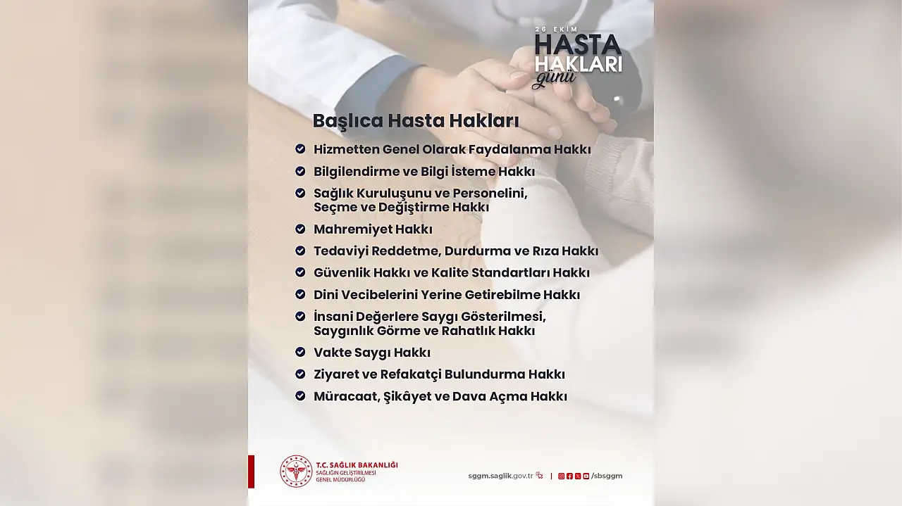 Sağlık Bakanlığı, Sağlığın Geliştirilmesi Genel Müdürlüğü 26 Ekim Hasta Hakları Günü dolayısıyla bilgilendirici paylaşımda bulundu. Yapılan paylaşımda hastalara hangi haklara sahip olduğu hatırlatıldı.