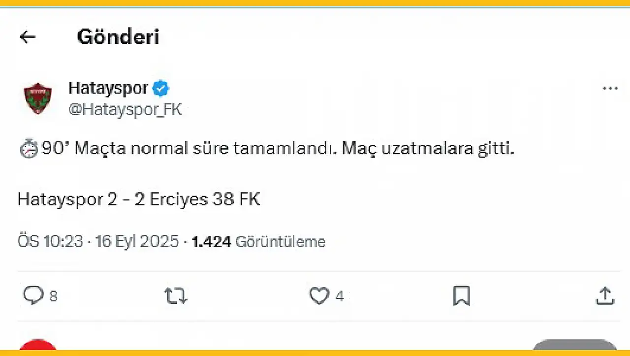 Maçın son dakikasında Hatayspor’dan yapılan paylaşım dikkatlerden kaçmadı. Hatayspor’dan yapılan paylaşımda, “90’ Maçta normal süre tamamlandı. Maç uzatmalara gitti. Hatayspor 2 - 2 Erciyes 38 FK” denildi.