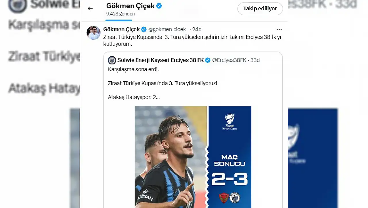 Erciyes 38 FK’nın bu başarısı herkesi sevince boğdu. Mavi-Siyahlılar, kimsenin beklemediği bir başarıya imza atarak türkiye'nin gündemine oturdu. Kayseri Valisi Gökmen Çiçek de, galibiyetin hemen ardından X hesabından kutlama mesajı yayımladı. Çiçek paylaşımında, “Ziraat Türkiye Kupası’nda 3. tura yükselen şehrimizin takımı Erciyes 38 FK’yı kutluyorum” dedi.