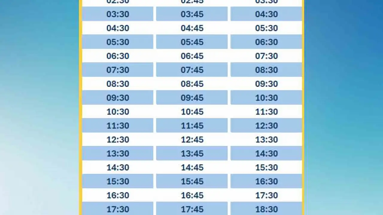 'Kalkış (Fuar Alanı): 00.30, 01.30, 02.30, 03.30, 04.30, 05.30, 06.30, 07.30, 08.30, 09.30, 10.30, 11.30, 12.30, 13.30, 14.30, 15.30, 16.30, 17.30, 18.30, 19.30, 20.30, 21.30, 22.30, 23.30