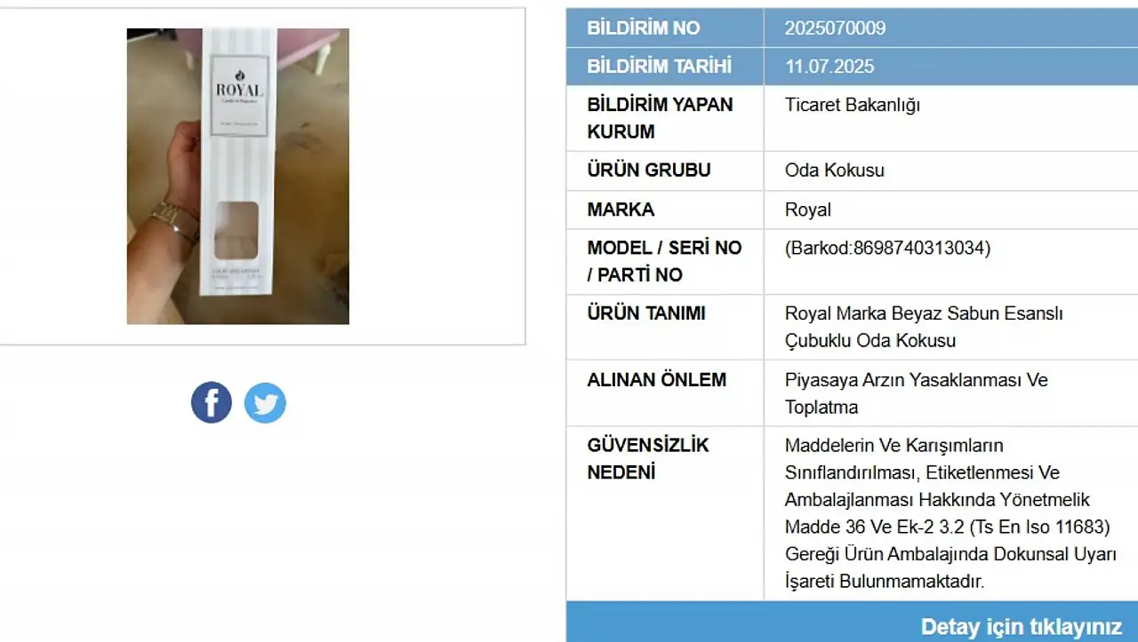 Ticaret Bakanlığı Güvensiz Ürün Bildirimleri listesinde Royal Marka Beyaz Sabun Esanslı Çubuklu Oda Kokusu (Barkod:8698740313034) yer aldı. Royalmum İmalat İthalat İhracat Sanayi Ve Ticaret Ltd. Şti. ait oda kokusunun güvensizlik nedeni ambalajında dokunsal uyarı işareti bulunmamasıyla açıklandı. Ürünün kimyasal, yanık ve yaralanma riski olabileceği belirtiliyor. Bu nedenle ilgili firmanın sadece bu koda tanımlı ürünün satışı yasaklandı.
