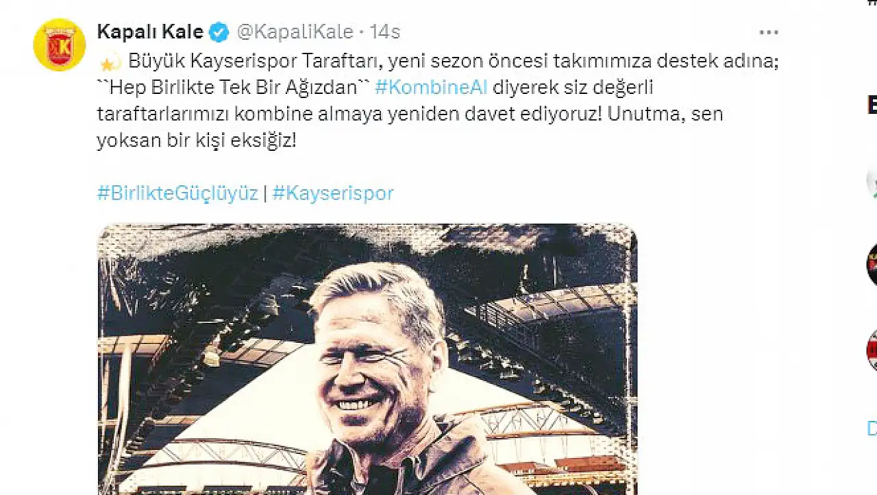 Kapalı Kale’den yapılan açıklamada, “Büyük Kayserispor Taraftarı, yeni sezon öncesi takımımıza destek adına; ‘Hep Birlikte Tek Bir Ağızdan’ Kombine al diyerek siz değerli taraftarlarımızı kombine almaya yeniden davet ediyoruz!” ifadeleri kullanıldı. Kayserispor’un geçtiğimiz sezon kümede kalmasında önemli bir destek veren Kapalı Kale, deplasman desteğiyle de büyük ses getirmişti.