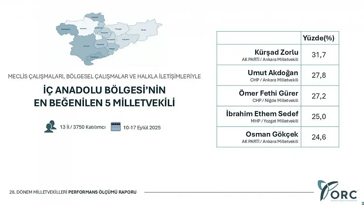 ORC Araştırma'nın 13 ilde yaptığı ankette İç Anadolu Bölgesi'nin en beğenilen 5 milletvekili belirlendi. Ankara ve Niğde'den isimler öne çıkarken, Kayseri'nin sıralamadaki yeri merak konusu oldu. Ayrıntılar Kayseri Anadolu Haber'de...