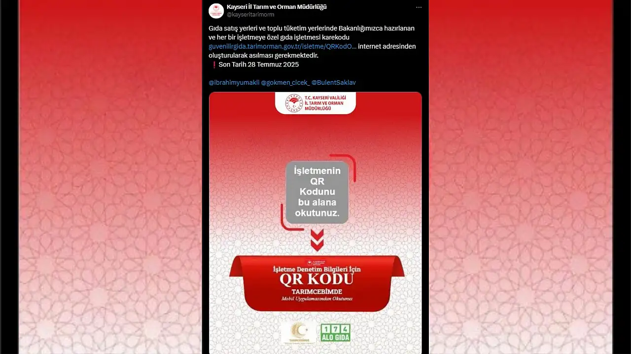 Türkiye genelinde geçtiğimiz aylarda Tarım ve Orman Bakanlığı tarafından yapılan açıklamayla 'Gıda Satış Yerleri ve Toplu Tüketim' işletmelerine yönelik QR Kod sistemi zorunlu hale getirilmişti. Kod temini için ise son tarih 28 Temmuz olarak açıklandı. Detaylar Kayseri Anadolu Haber'de…