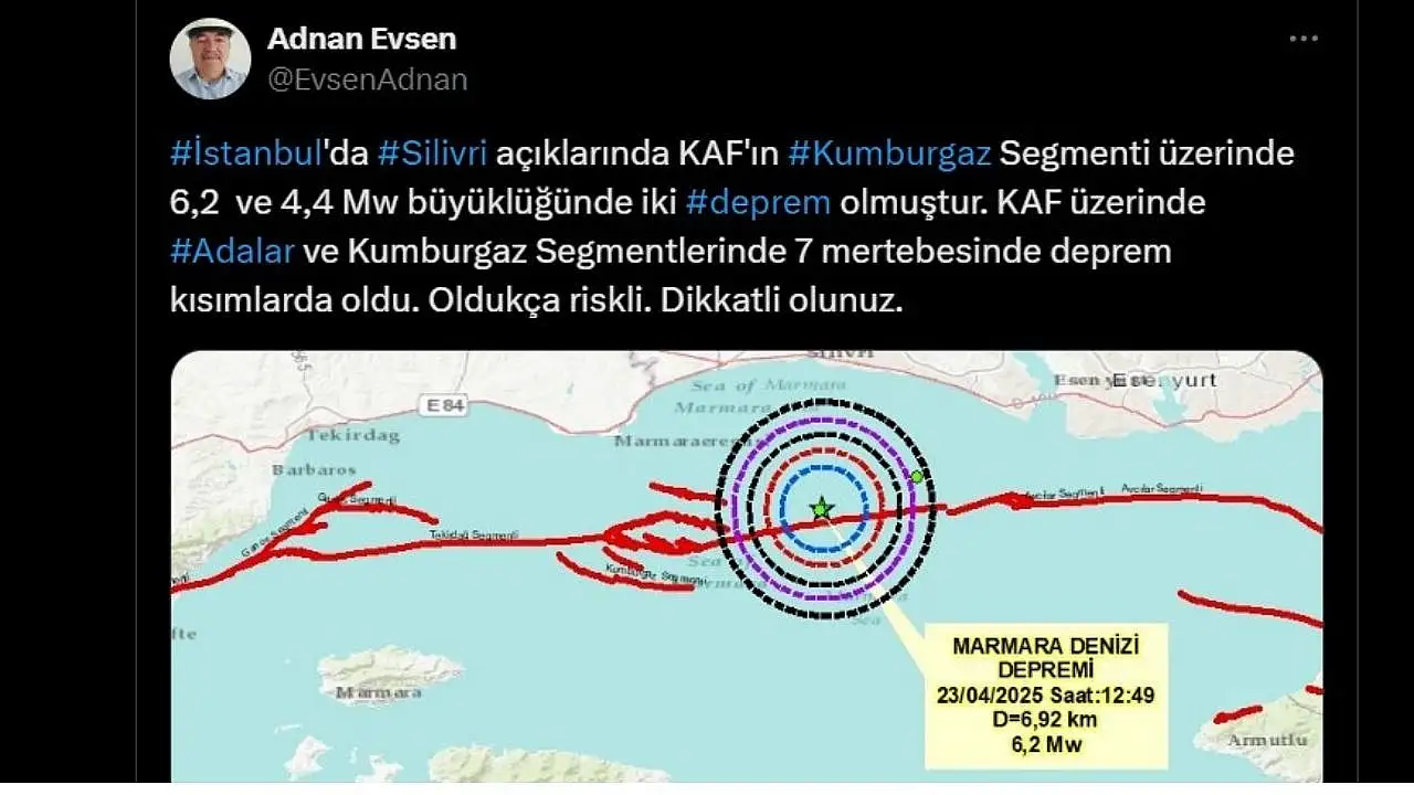 İstanbul'da iki ayrı deprem meydana geldi. İlk belirlemelere göre depremin merkez üssü Silivri açıkları olarak kaydedildi. Deprem, çevre illerden de hissedildi. Jeoloji Mühendisi Adnan Evsen, sosyal medya hesabından dikkat çeken bir paylaşım yaptı.