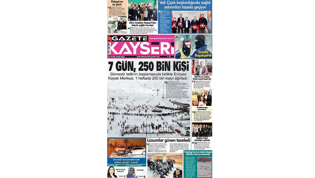 Gazete Kayseri manşetinde ‘7 Gün 250 Bin Kişi’ başlığı ile Erciyes Kayak Merkezi’ne yer verdi. Sömestir tatilinin başlamasıyla birlikte Erciyes Kayak Merkezi 1 haftada 250 bin kişiyi ağırladı.