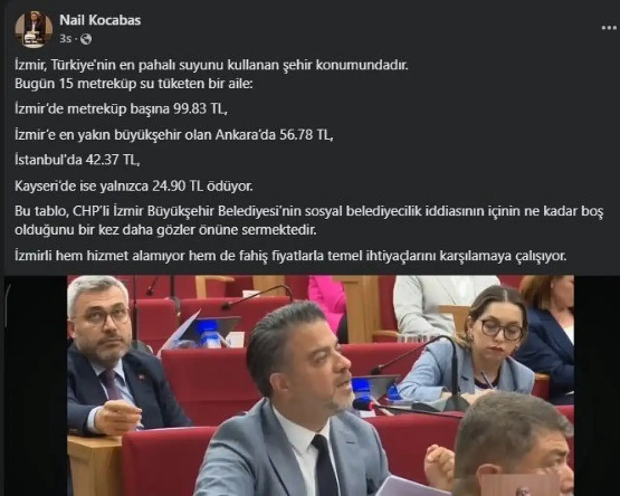 AK Parti İzmir Gaziemir Meclis Üyesi Nail Kocabaş İzmir'de suyun metreküp fiyatının 99,83 TL olduğunu ve İzmirlinin Türkiye'nin en pahalı suyunu kullandığını söyleyerek, 24,90 TL olan Kayseri'yi örnek gösterdi. Detaylar haberimizde...