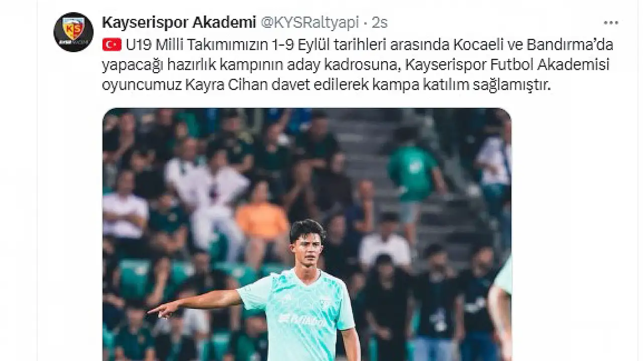 Kayserispor Akademi’den yapılan paylaşımda, “U19 Milli Takımımızın 1-9 Eylül tarihleri arasında Kocaeli ve Bandırma’da yapacağı hazırlık kampının aday kadrosuna, Kayserispor Futbol Akademisi oyuncumuz Kayra Cihan davet edilerek kampa katılım sağlamıştır” bilgisi verildi..