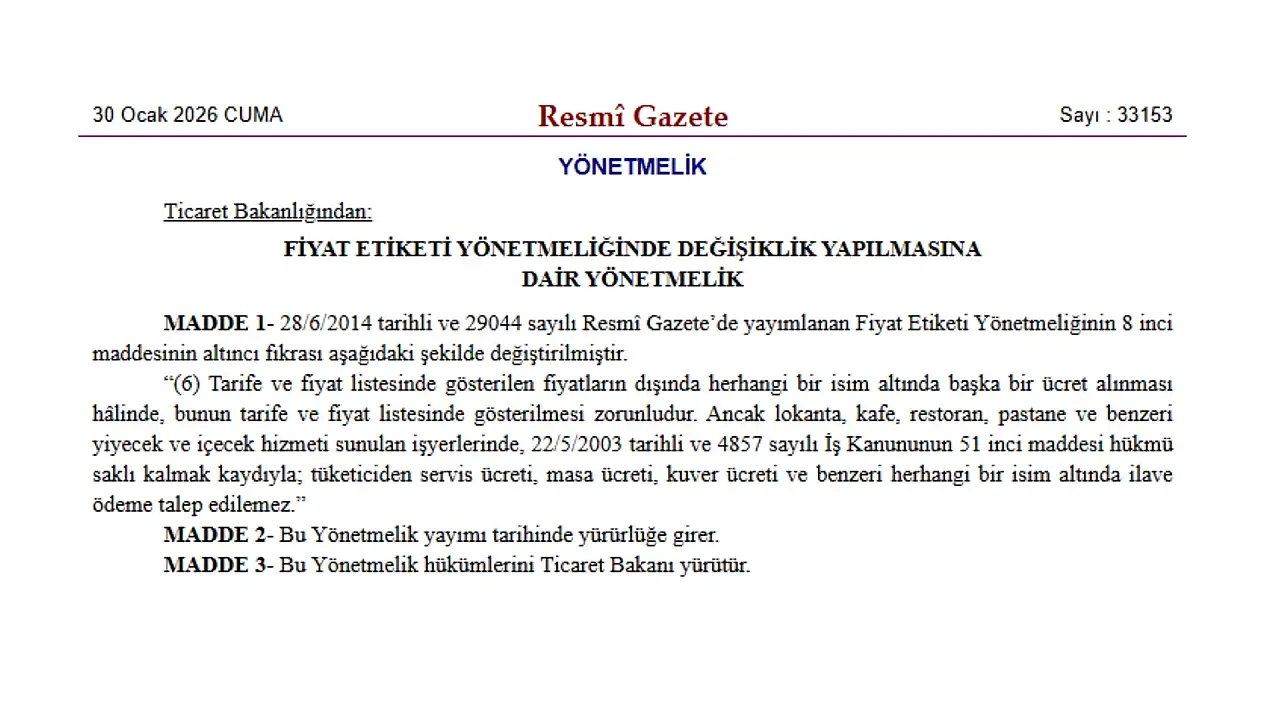 Ticaret Bakanlığı, tüketicilerin korunmasına yönelik önemli bir düzenlemeyi hayata geçirdi. Resmî Gazete’de yayımlanan yönetmelik değişikliğiyle birlikte, özellikle yiyecek ve içecek hizmeti sunan işletmelerde tüketiciden alınabilecek ek ücretlere net sınırlamalar getirildi.