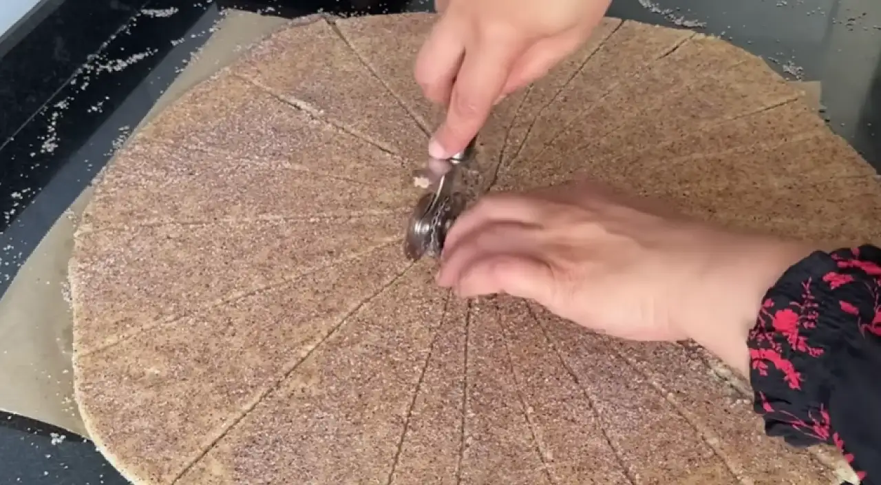 Bir su bardağı cevizi robotta ince çekelim. Üzerine bir su bardağı toz şeker ve tarçını ekleyelim. Hazırladığımız harcın yarısını yağlı kağıda serip üzerinde hamurumuzu açalım. Hamuru biraz yaydıktan sonra kalan harcı da üzerine ekleyelim. Yavaş yavaş hamuru merdane yardımı ile açalım. Formunu çok bozmadan hamuru açarken yana kayan şekerleri geri hamura ekleyelim.
