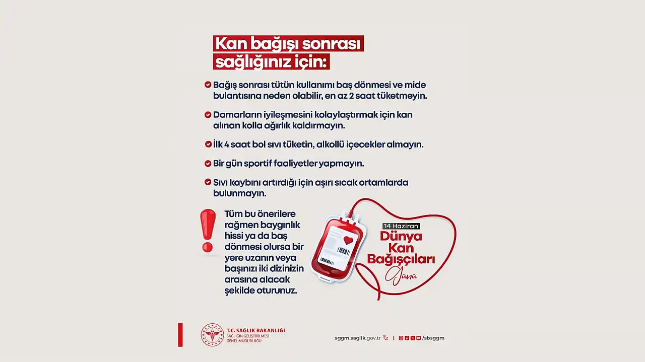 Sağlık Bakanlığı, Sağlığın Geliştirilmesi Genel Müdürlüğü sosyal medya hesabı üzerinden yaptığı paylaşımlarla vatandaşları bilgilendirmeye ve önemli bilgiler paylaşmaya devam ediyor. Yapılan yeni paylaşımda kan bağışı sonrası neler yapılması gerektiğine dair bilgilere yer verildi.