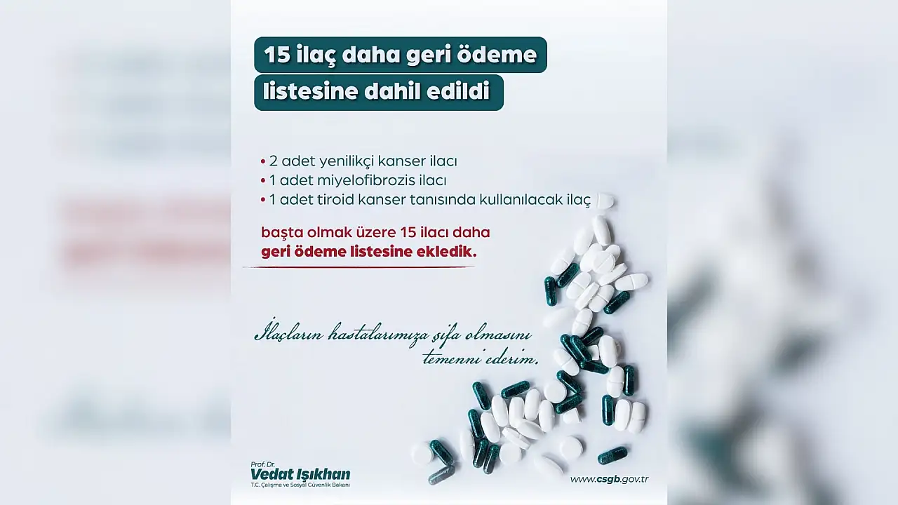 Çalışma ve Sosyal Güvenlik Bakanı Vedat Işıkhan sosyal medya hesabı üzerinden yaptığı açıklamada kanser hastalığı ile mücadele kullanılan ilaçlar başta olmak üzere 15 ilacın daha geride ödeme listesine dahil edildiğini açıkladı.
