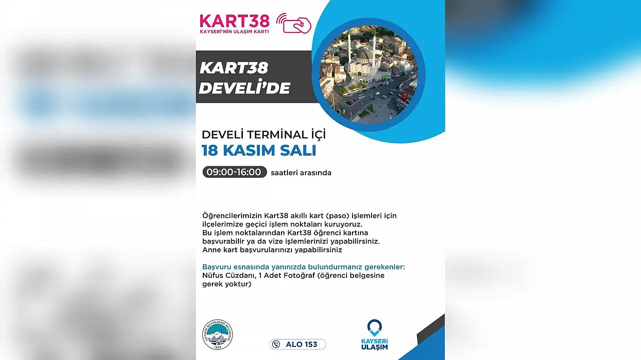 Kayseri Ulaşım AŞ, Kart38 öğrenci kartı ve vize işlemleri için Develi'ye geçici işlem noktası kuruyor. Peki, başvuru hangi gün ve hangi belgelerle yapılacak? Detaylar Kayseri Anadolu Haber'de...