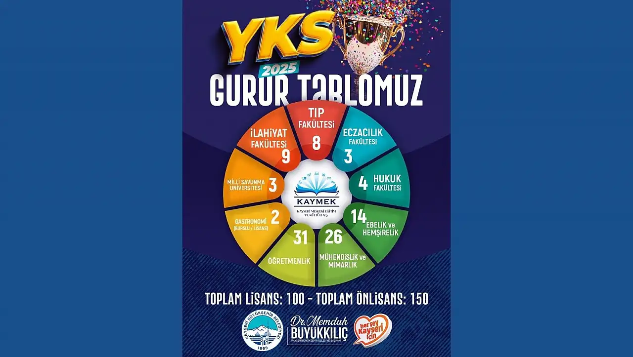 KAYMEK çatısı altında ücretsiz YKS kurs hizmetinden yararlanan öğrenciler arasından, 8 Tıp, 3 Eczacılık, 4 Hukuk, 14 Ebelik Bölümü ve Hemşirelik, 26 Mühendislik ve Mimarlık, 31 Öğretmenlik, 2 Gastronomi, 3 Milli Savunma Üniversitesi ve 9 öğrenci ise İlahiyat bölümlerine yerleşme başarısı gösterdi.