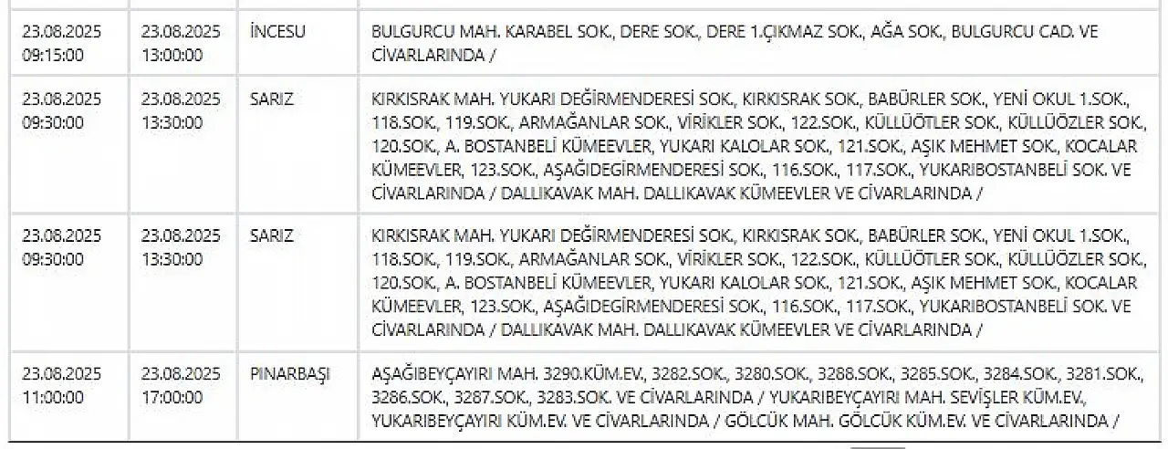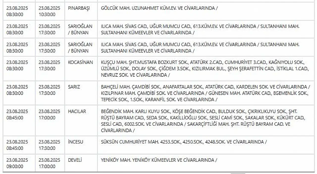 KCETAŞ’tan edinilen bilgilere göre yarın (23 Ağustos 2025) aşağıdaki ilçe ve mahallelerde elektrik kesintisi yaşanacak.