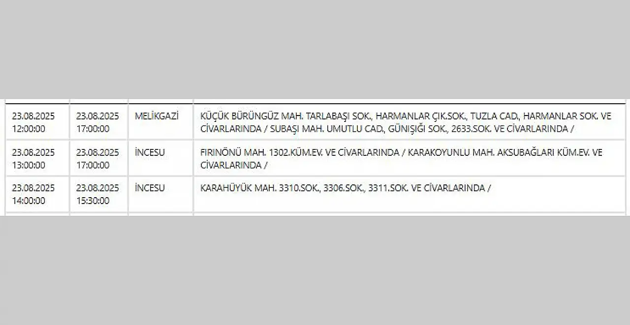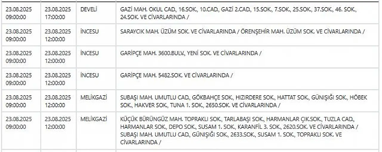 Kayseri'de bugün hangi mahallelerde elektrik kesintisi yaşanacak? – 23 Ağustos 2025