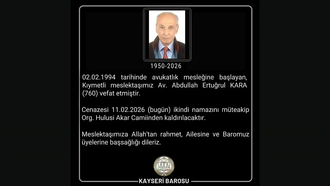 Kayseri Barosu sosyal medya hesabından yapılan paylaşımda, ‘02.02.1994 tarihinde avukatlık mesleğine başlayan, Kıymetli meslektaşımız Av. Abdullah Ertuğrul KARA (76) vefat etmiştir. Cenazesi 11.02.2026 (bugün) ikindi namazını müteakip Org. Hulusi Akar Camiinden kaldırılacaktır. Meslektaşımıza Allah'tan rahmet, Ailesine ve Baromuz üyelerine başsağlığı dileriz’ ifadelerine yer verildi.