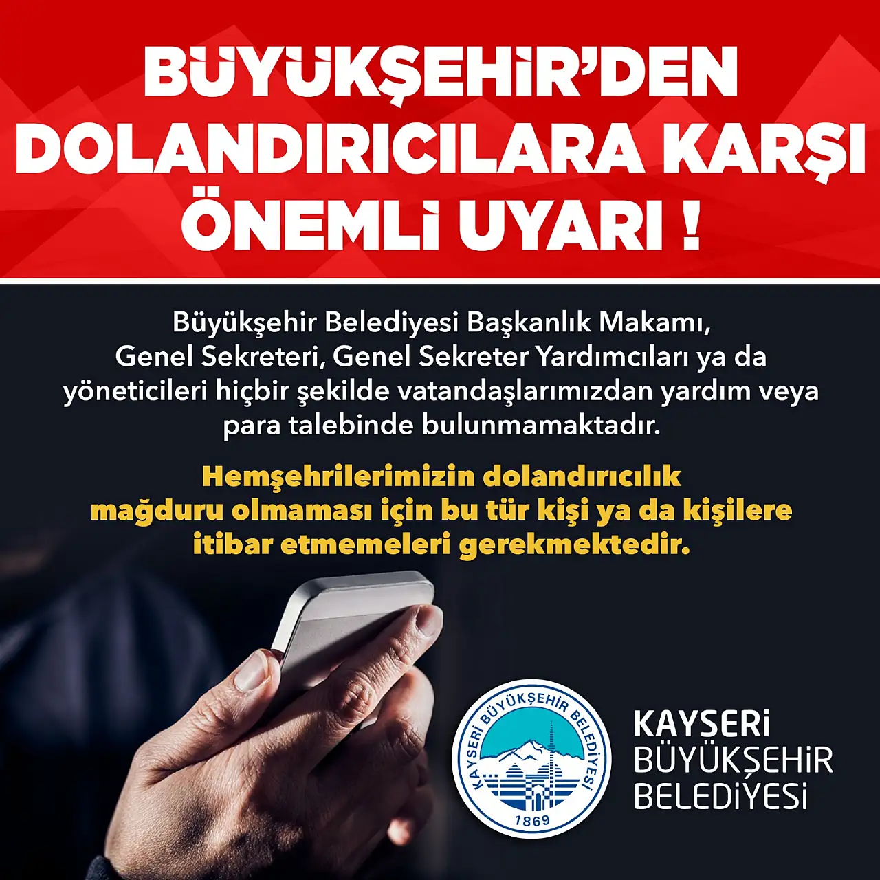 Kayseri Büyükşehir Belediyesi, bazı üst düzey yöneticilerin ismini kullanarak dolandırıcılık girişiminde bulunan art niyetli kişiler konusunda vatandaşları dikkatli olmaya çağırdı.