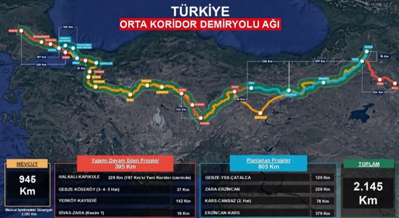 Proje kapsamında Türkiye sınırları içindeki mevcut demiryolu uzunluğu 945 kilometreyi buluyor. Yapımı devam eden projeler 395 kilometre, planlama aşamasındaki hatlar ise 805 kilometre uzunluğa sahip. Böylece Türkiye’nin Orta Koridor içindeki toplam demiryolu uzunluğu 2 bin 145 kilometreye ulaşacak.