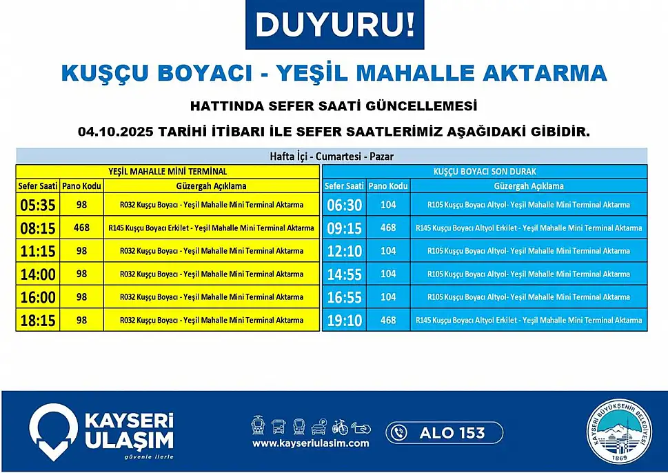 Kayseri Büyükşehir Belediyesi iştirak şirketi olan Kayseri Ulaşım A.Ş. tarafından yayımlanan duyuruya göre Kayseri'de yarın (4 Ekim Cumartesi 2025) itibariyle çok sayıda güzergah ve sefer saatinde düzenleme ve değişikliğe gidildiği duyuruldu. Detaylar Kayseri Anadolu Haber'de...