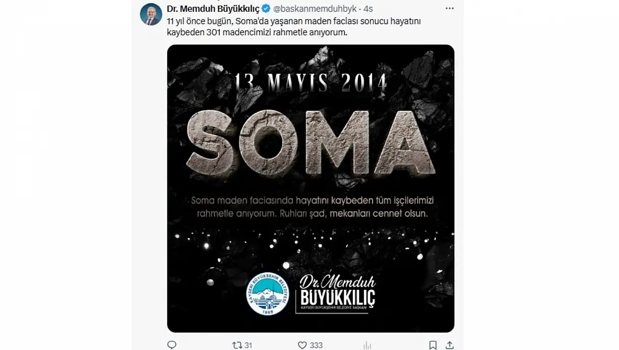 Kayseri Büyükşehir Belediye Başkanı Memduh Büyükkılıç, 11 yıl önce bugün Soma’da yaşanan maden faciasında hayatını kaybeden 301 madenciyi rahmetle andı.