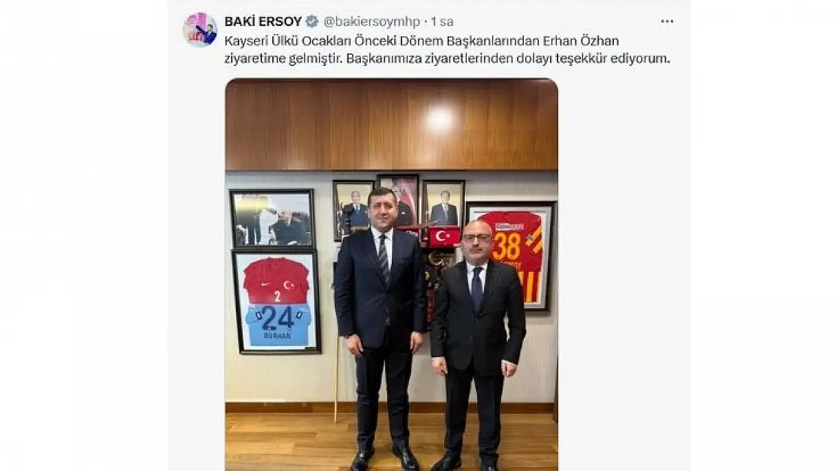 Kayseri Ülkü Ocakları önceki dönem başkanlarından Erhan Özhan, MHP Kayseri Milletvekili Baki Ersoy’u makamında ziyaret etti. Milletvekili Ersoy, nazik ziyaretinden dolayı Özhan’a teşekkür etti.