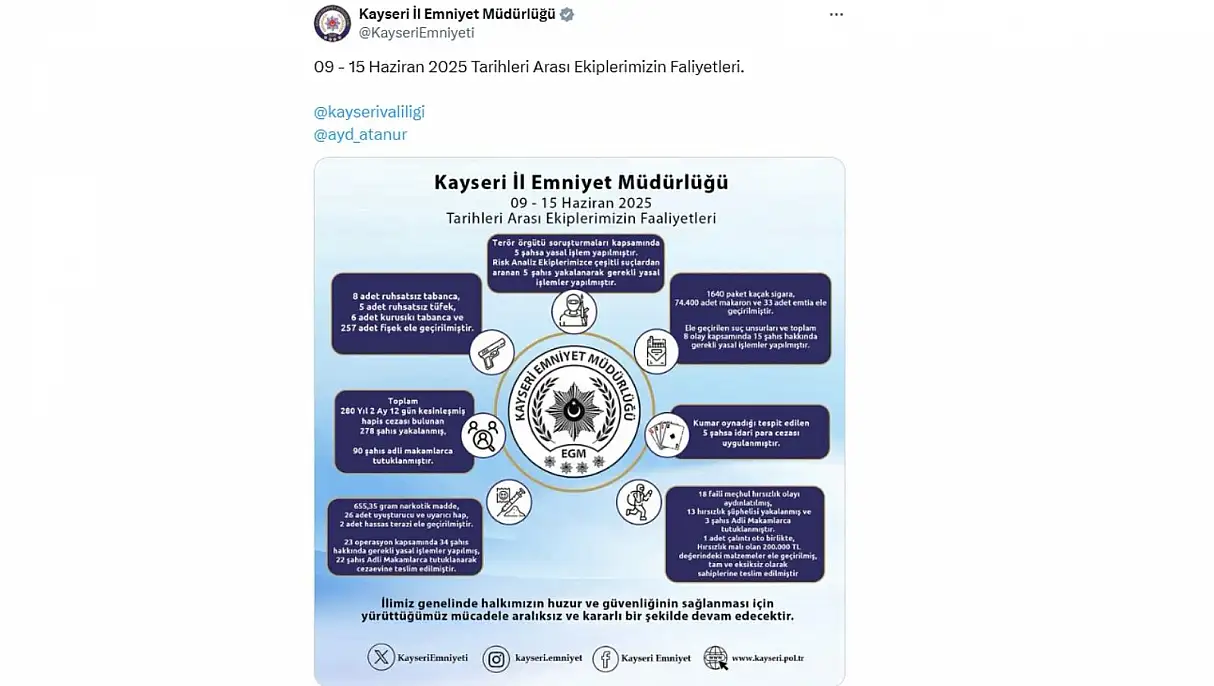 Kayseri İl Emniyet Müdürlüğü sosyal medya hesabından yaptığı paylaşımla 9-15 Haziran tarihleri arasında gerçekleştirilen operasyonların detaylarını yayınladı.