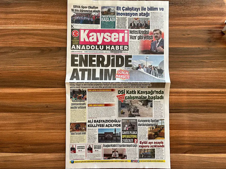 Kayseri’de sürdürülebilir yatırımlara dikkat çeken Kayseri Anadolu Haber Gazetesi ‘Enerjide Atılım’ başlığıyla manşete çıktı. Kamuoyuna sunulan haberde şehirde planlanan güneş, rüzgar ve atık enerjisi projelerinin sürdürülebilir hedeflere katkı sağladığına yer verildi.