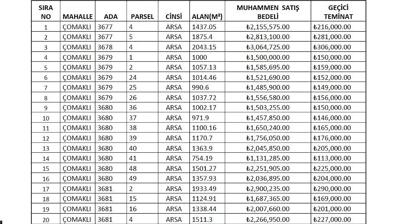 Listede yer alan arsaların büyüklükleri 754 metrekare ile 2.043 metrekare arasında değişirken, muhammen bedeller ₺1 milyon 131 bin ile ₺3 milyon 64 bin arasında. Geçici teminat bedelleri ise ₺113 bin ile ₺306 bin olarak belirlendi.