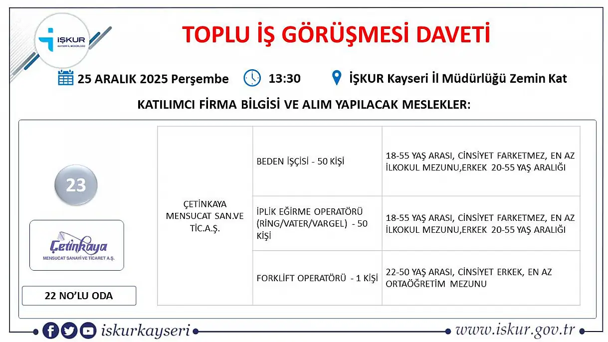 Kayseri'de 2025'in son fırsatı: Toplu iş görüşmesi ile 24 firma 598 yeni personel alacak!