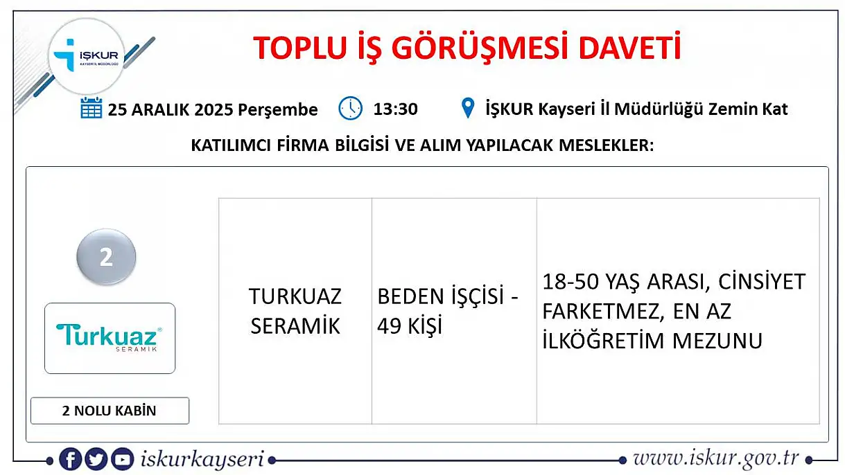 Kayseri'de 2025'in son fırsatı: Toplu iş görüşmesi ile 24 firma 598 yeni personel alacak!